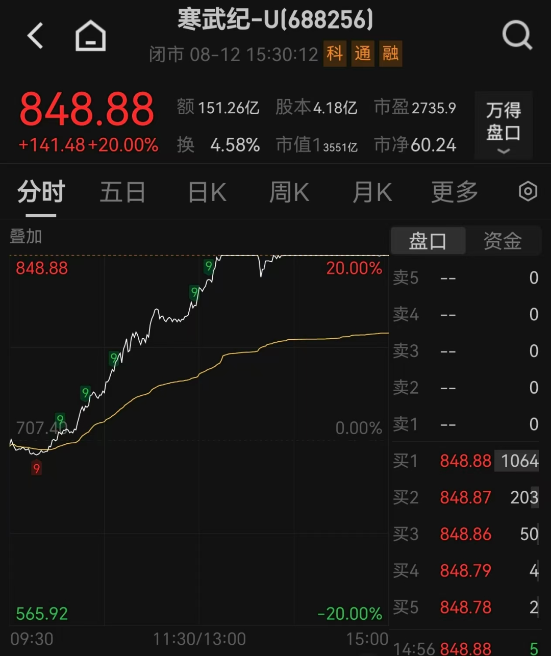 8月12日,市场全天震荡走高,沪指录得7连阳,三大指数均再创年内新高。芯片股午后爆发,寒武纪(688256.SH)20cm涨停创历史新高,最新市值达3551亿元。